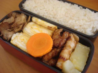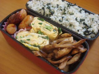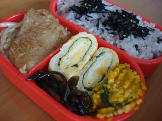 ・豚肉炒め・だしまき卵・まいたけのバター炒め・さつまいもとりんごの煮物今日から新しいお弁当箱です。今度は角のある四角いお弁当箱を探しました。でも、赤がなかったので初の黒です。卵が縦にしても横にしてもちょっとだけ隙間が開くので、ぺらぺら卵を挿入しておきました。