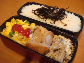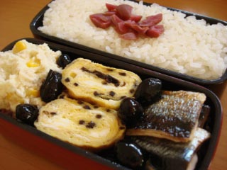 ・焼き魚・塩昆布入り卵焼き・黒豆・ポテトとコーンのサラダ久しぶりに登場しました、見栄えの悪い卵焼き。おまけに塩昆布が入っているにもかかわらずいつもと同じようにしょうゆを入れてしまったのでちょっとしょっぱい・・・。