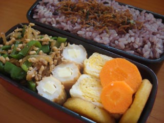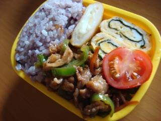 ・豚と野菜炒め・のり巻き卵焼き・トマト・じゃがいももち赤いリサ&ガスパールのお弁当箱が壊れてしまったので黄色です。トマトと黒米の赤がありがたい。