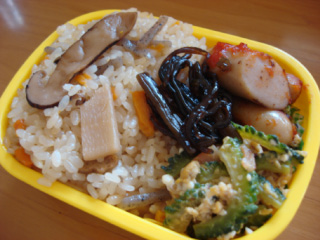 ・松茸ごはん・ゴーヤ炒め・ウインナー・キャラブキ市販の松茸入り釜飯の素で炊いたものですが、しっかり松茸の香りがしておいしいです。しかしこれほど具が大きいのは中国産? 深く考えないようにしよう。