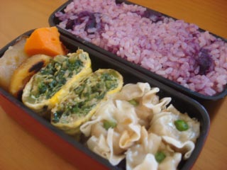 ・紫芋ごはん・焼売・大根菜炒め入り卵焼き・煮物・アンパンマンポテト紫芋を入れてご飯を炊いたら素敵な色になりました。生協でたのんだ中華屋さんの焼売、お弁当にちょうど良いです。今日もあんぱんまんポテト、潜ませました。