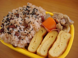 ・赤飯・煮物・はんぺん入り卵焼き赤飯と煮物は叔母にもらったもの。詰め方は悪いけど、かなりおいしいです。卵とはんぺんをバーミックスでどろどろに混ぜて焼いた卵焼き、ふもふもおいしい。