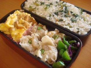 ・青菜入りごはん・稲荷揚げ入り卵焼き・野菜炒め・焼売今日も焼売入りました。味付き稲荷揚げは甘くておいしいね。