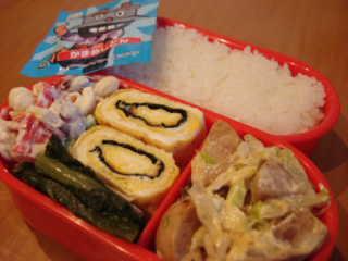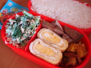 ・かぼちゃのコロッケ・春菊とツナのサラダ・卵焼き・鶏レバー写真ではアンパンマンふりかけが写っていますが、入れるのを忘れました。そして、写真には写っていない、ちびちゃんのおやつ用に作った焼きサツマイモを追加しました。