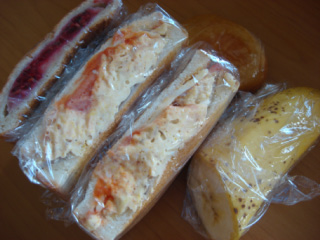 ・サンドウィッチ・クランベリーのペイストリー・じゃがいもチーズ餅・バナナ6枚切り食パンを無理やり更に半分に切ってサンドウィッチ用の薄さにしました。やればできるもんだ。しかし見た目は悪い。