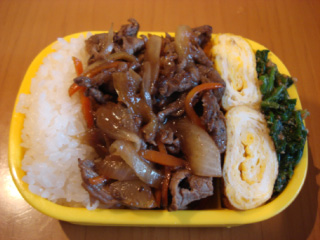 ・牛肉と野菜炒め・卵焼き・ほうれん草の胡麻和えちょっと牛肉は味が濃かったかな。やっぱりこのお弁当箱だと赤がほしくなります。