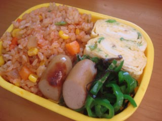 ・ケチャップライス・ピーマンの塩昆布和え・ウインナー・ねぎ入り卵焼き冷凍ご飯を総動員でケチャップライスにしました。ピーマンをさっと茹でて塩昆布で和えた物はちびちゃんも大好き。