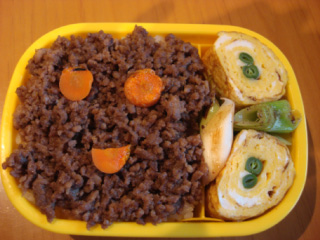 ・そぼろ・いんげん入り卵焼き・ねぎのバター炒め・にんじん赤がほしかったのでにんじんに砂糖をまぶしてチンして乗せました。このまま顔になっているか、蓋にくっついているか・・・。
