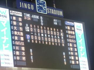 遅ればせながら、今季初の生観戦である。今年もついつい薄着で出掛けてしまい、神宮球場の左翼席で震える羽目になってしまった。9回表の時点では2時間半ほどだったのが、まさか延長11回、4時間近くの熱戦にもつれ込むとは。今日は久しぶりだし、あえて!長々と書くぞ。試合前のスタメン発表。オーダーには意外な名前が並んだ。1番・森山、2番・野中、3番・大引、4番・李大浩、5番・バルディリス、6番・安達、7番・川端、8番・鈴木、9番・木佐貫。坂口が前節の巨人戦で右肩脱臼してしまったため、森山、野中という快速コンビを1・2番に。普段2番を打つ大引は3番に置き、更に6番に新人の安達を初めてスタメンで使ってきた。……アレ!? キャプテェェェエェン!?貧打、拙守、故障者続出という三重苦にあって、現在、チームは泥沼の6連敗中。はたして、この打線で打開できるのか!?そんな中で始まった試合。先制点は2回、ヤクルトだった。二死から、まさかのロマンかよ!投手とは思えない技ありの一打orzその後も、田中に安打を許して満塁。しかし、ここで崩れ切らないのが今年の木佐貫だ。森岡をフォークで屠り、最少失点に抑えると、以後、危なげない投球を見せていく。問題は、やはり打線だった。3回、先頭の川端がチーム初安打を放つも、続く鈴木が初球をゲッツー。4回、これまた先頭の野中がファールで粘り続け、せっかく内野安打をもぎ取ったのに、3番・大引は2球目をあわやゲッツーの三ゴロ。走ることも、送ることもせず、俊足の走者を殺した上、更に次の4番・李大浩が注文通りのゲッツー。6回には、数少ないポイントゲッター・バルディリスが、何やら足を痛めたらしく、ベンチに引っ込んでしまった。あまりの酷さに苛立って、怒って、呆れ果てて……。「馬鹿か!!!!!」思わず声に出てしまったよ。ってか、左翼席で吐かれる嘆息がどれだけ多かったか。ところが、遂に流れが傾く。7回裏、木佐貫が二死満塁のピンチを凌いだ直後=8回表。岡田監督が1枚目のカードを切ったのだ。代打・後藤。5球目を引っ叩き、初めて二塁を踏んだ。普段ならここで適時打待ちの岡田監督だが、川端には犠打。一死三塁。48の自滅技“鈴木に代打を出さない病”が発病する恐れもあったが、代打・北川。低めの球を上手く掬い上げると、打球は距離十分。見事、犠飛で同点である。よぉし、これでわからなくなったァ!しかし、懸念はあった。今年、平野がよくない。去年のような絶対的な信頼感が感じられない。案の定、先頭打者に安打を許すと、畠山にフェンス直撃の二塁打を打たれ、勝ち越されてしまう。Bs 000 000 01S 010 000 01残すは9回表。ヤクルトはバーネットをマウンドへ。前列で観戦していた親子が、席を立った。その隣で観戦していた4人組も諦めた様子だった。でも、この試合はここからが長かった。先頭は代打・T。しかし、怪我で試合から長らく離れており、まともに打てるかは疑問符が付いた。投ゴロ。次は野中。実はここまで自分の持ち味を生かすべく、逆方向に転がそうという姿勢は好感度が高かった。三遊間を抜ける安打。一死一塁。相手は外国人投手だ。揺さぶれ、揺さぶれ!左翼席からは「走れ」コール。大引、あっさり見逃し三振。二死一塁。残るは、李大浩のみとなった。ポンポンとストライク2つ。野中は何故か走らない。我が家も観念した。ところが、李大浩は伊達じゃなかった。カウント3-2から、6球目を強振!打球がこっちに向かってくる、向かってくる。ほぼ真後ろ、3メートルくらいだろうか、通路に着弾!Bs 000 000 012S 010 000 01左翼席、狂喜乱舞である。敗北まであと1球という土壇場からの逆転劇。いやあ、いい試合だったなあ。誰もが、そう思った。……に違いないのだが、岸田が。勝利まであと1球と追い込みながら、藤本に同点打orzBs 000 000 012S 010 000 011今季初の生観戦は延長戦へと突入した。延長10回表、オリックスは押本を攻め立てる。まず、先頭の後藤がセンター前へ。すると、川端がまたも犠打成功。打席には、鈴木に代わって守備に入っていた斉藤。……だったのだが、初球を内野フライ。一体、鈴木といい、斉藤といい、何を考えているのか。頼むから“進塁打”って言葉を覚えてくれよ。案の定、次の中村が安打を打っても還って来られず、代打・荒金も遊ゴロに倒れて無得点。引き分け規定の3時間半まであと13分。マウンドには、香月。今、ウチの中継ぎの中では、最も安定感があるかもしれない男。三者凡退! 時間も、まだ残っている。Bs 000 000 012 0S 010 000 011 0延長11回表ッ!ヤクルトは左腕の日高を送り出してきた。野中、右飛。大引、またも右飛。あっという間に二死である。またしても、李大浩頼りの場面となった。しかし、次の打者はバルディリスの代役・山崎。臭い所ばかりを投げてくるのは容易に想像できた。はたして、結果は臭い所どころか、明らかなボール球を4つ投げて四球。んん?ここで、ヤクルトベンチは日高を降ろし、増渕を登板させてきた。んんん?