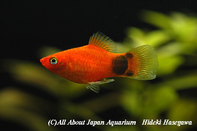 レッドミッキーマウス・プラティ学 名:Xiphophorus maculatus var通称名:英 名:分 布:改良種:メキシコ、グァテマラサイズ:♂4cm ♀6cmTemp :18-25℃pH :7.0-8.0 尾びれの付け根の模様が、ミッキーマウスを横にしたような模様に見えることから人気が高い。個体に拠って模様の鮮明さにはムラがあるため、より品種の特徴が現れている魚を選ぶと良いだろう。 ■コメント:飼いやすくミッキーのがらがカワイイ~(≧▽≦) ■オススメ度:★★★★☆