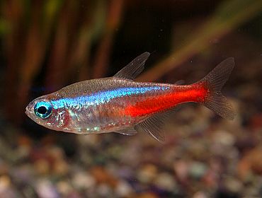 ネオンテトラ学 名:Paracheirodon innesi (Myers,1936)通称名:英 名:Neon tetra 分 布:南米:ソリモエス川支流サイズ:4-5cmTemp :20-26℃pH :5.0-7.0テトラと言えば本種を指すほど、普及率の高い人気種。香港で養殖されたものが大量に輸入され、どこのショップでも目にすることができ、大小各サイズが販売される。飼育は容易で何にでも餌付くが、餌の与えすぎは肥満になりやすく、プロポーションを維持するために餌は控えめぐらいが良い。その普及率とは相反し、繁殖難易度は高い。稚魚のサイズが極小であることから、産卵後の過程が難しいそうである。通常種の他に色彩変異を固定した、プラチナネオン、アルビノネオン、ニューレッドゴールデンネオンなど数種が知られる。コメント:とにかく安くてキレイで飼いやすい特に初心者にオススメオススメ度:★★★★★