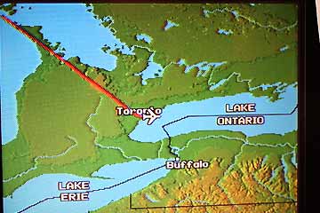 <4月9日(水) part4>トロント上空(Toronto):到着まであと1時間と言うところで、トロント上空を通過しました。ふと機外カメラの映像を見ていると、市中心部にそびえ立つ世界一高い「CNタワー」が見えました!このタワーは高さ553mですが、新東京タワーはこれを抜くそうです。地図はトロント上空だったので カメラにすると真下にトロント市街が見えました到着間近:あと30分で到着です!