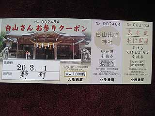 <3月1日(土) part3>白山比め神社(しらやまひめじんじゃ):白山比め神社(しらやまひめじんじゃ)は白山市三宮町の神社で、白山神社の総本社です。白山山頂にある神祠を奥宮、下白山の神社が本社となります。加賀一の宮駅から徒歩で2分で表参道の鳥居、拝殿まで約10分です。周辺地図高さは約6mの大鳥居です。ここからが表参道が始まります。大鳥居約250mにわたる境橋から神門までの表参道です。表参道白山さんのご鎮座は今から2090余年の昔、現社地としては約520年の歴史だそうです。山門と拝殿白山比め神社(しらやまひめじんじゃ)白山市三宮町HP:http://www.shirayama.or.jp/Googleマップリンク・参道・いっぷく処おはぎ屋:参道・大鳥居の前にあるお休み処「おはぎ屋」さんです。ここではクーポン券でおはぎかどぶろくを頂けます。外観店先に「今日のマイナスイオン数」が掲載されていました。おはぎがなく、どぶろくで心地よく!どぶろくいっぷく処おはぎ屋白山市白山町レ122-1tel:0761-92-5510HP:http://www2.icnet.or.jp/~ohagiya/index.html