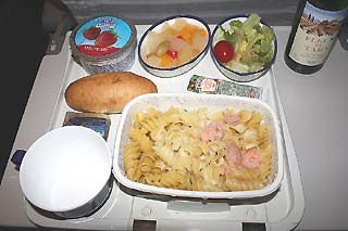 <4月15日(火)>機内食2回目・JL5 Y JFK→NRT:出発から10時間(到着4時間前)、カムチャッカ半島沖通過中に2回目の食事です。2008.Apr.14 JL5 Y JFK→NRT<到着前>トルテリーニパスタ 小海老添えヨーグルトフルーツ カクテルフレッシュ サラダサウザンアイランドドレッシングロール、バターend
