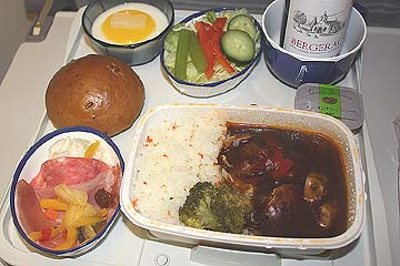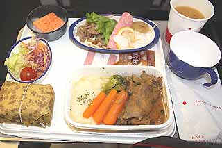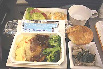 <4月26日(土) part2>機内食・JL605 Y KIX→CAN:機内食です。広州までの距離は短距離とも中距離とも言える距離なのですが、ここでは普通に飲み物~食事がサーブされます。JALの中国線の売りはデフォルトで味噌汁と俵御飯の提供です!2008.Apr.26 JL605 Y KIX→CANスライスビーフ グリーンペッパーコーンソース添えビーフとシーフードのマリネフレッシュ サラダストロベリー ムース御飯味噌汁