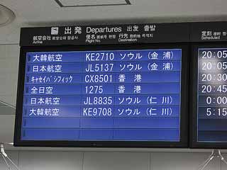 4月からANAの羽田=香港線が就航したので、週末休暇不要の香港を体験しました。<4月4日(金) part1>羽田空港:ANAの新規就航便は羽田20:45発→香港0:30着と、週末ならば仕事を終えてから羽田空港に向かえば間に合う時間設定、いろいろなブログで「夜中に着く香港行きは需要があるのか?」のような書き込みがたくさん見られますが、全くの認識違い!?週末は同様な時間設定のソウルやグアム行きのチャーター便はOLを中心にした観光需要があります(と言うことは週末だけでもいいのかな?)し、この路線はむしろ逆に香港から日本への週末観光の需要を見込んでいるので、ブログの心配はご無用と言うことのようです。その証拠に、この路線はあくまでチャーター便なので一般チケット向けの座席提供数には制限がありますが、この便でも数週間前にはキャンセル待ちになっていました。また、香港からのアウトバウンド需要がある事の裏付けとして、同日のほぼ同じ時間にキャセイ航空の羽田=香港のチャーター便(こちらはツアーだけのチャーター便)が設定されていました。出発案内、この日は定期チャーター以外にキャセイ香港行きとJAL深夜ソウル行き、大韓航空早朝ソウル行きなど結構設定多しです出発案内に Hong Kong が!2便分の香港行きの乗客で混雑していました