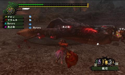 あかねこハンマーが完成したので、剛種チケットを集めるべくヴォルガノスちゃんを殴りにいってきました♪落とし穴に落ちたところを、麻痺→スタン→麻痺→スタン・・・っとループさせて一方的に攻撃しまくるという例の戦法です^^v剛チケヴォルは、ボウガン禁止で麻痺ガン使えませんから、★麻痺属性の片手剣または太刀で麻痺させる役目→亮っち、ルルさん★麻痺属性ハンマーでスタンさせる役目(麻痺の補助も)→団長、アビちゃんという編成での攻略が一般的ですね(・ω・)bガチりたいという人は別ですがw状態異常強化のスキルもあるとなおよし!なので、シルアカにチャチャブーフェイクをかぶるといいみたいです(-ω☆)どっちもないアビちゃんは、すんませんがトリアカで参加しました(-人-)慣れるまでは、穴から出ちゃったり轢かれてチーンってことになっちゃったり・・・w4人が慣れてきたら、一度も穴から脱出させずに討伐することができました~:*.;".*・;・^;・:\(*^▽^*)/:・;^・;・*.";.*: ワーイ♪ルルさんは片手で首をねらっていたところ、ヴォルが動くので場所がちょっとずつズレて、結局ヴォルの周りを斬りながらぐるっと一周していました(≧ω≦)bそれを見た亮っちが、めちゃウケていましたwさてさて、ハンマー担当のアビちゃんが教わったこと1.ホストじゃないハンマーは、ラグがあるので早めに振りかぶること2.スタン耐性ついてくる後半は、確実に縦3を二回入れないとスタンしないよ3.麻痺して頭が下がってきたと同時に、縦3の一発目を当てないと間に合わない4.ハンマーの麻痺はおまけ程度だから、麻痺させようとがんばらないでスタンを第一に考えることサブのヒレ破壊と頭破壊はすぐなので、サブクリアで回すのもアリ^^サブだとチケット確定じゃなくなるけど、そんなにでなくもないです。あかねこハンマー完成前に、笛で参加させてもらってサブまわしをやってみたところ、8回くらい行って19枚も出たことがありましたヾ(*ΦωΦ)ノ