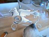 朝から悪天候で、室内はジト~っと湿気が多い。風呂場と洗面所の排気口に電源を入れ、除湿器を使って少しスッキリしました。しかし外は横殴りの雨。犬君たちはつまらなそう。午後になって晴れたは良いけど、半袖でも暑い。道路も乾いて散歩にはうってつけだけど、ちょっとこの暑さじゃムリだな。犬君たちにはハウスでじっとしてもらい、駅前の小さな雑貨屋さんに行って来ました。今日欲しいもの。それは蓋のついた保存容器です。できればホーローが宜しい。犬君たちのご飯入れは、大きなゴミ箱です。それに食品についていた乾燥剤を入れています。これ、どんなに小さくても捨てずにご飯入れに入れているから、カップでドッグフードをとる度に、フードは減るけど数が減らない乾燥剤ばかりが入るようになってしまい、忙しい朝は乾燥剤をはじくのが面倒でなりません。邪魔な乾燥剤を炊飯ジャーの前に置いておくと、気付けばあちこちに移動して汚らしい。可愛い雑貨屋さんなら、可愛い容器も売っているだろう、と思ったら、これに一目惚れ。鳥さんが枝をくわえているロウソク置きです。どうも鳥モノにヨワく(なんだか幸せを運んで来てくれそう)、ロウソクにも弱い私。衝動買いでした。キッチンのカウンターに置いて、ウゥ~ン、キャワいい!どこに置くといいかなぁ、と独り言。と、こてつ君が新入りに挨拶にきました。とにかく、なんでも、新しいものは嗅がずにはいられない。こたろう君もクンクン。しつこいから、クンクンがそのうちブオッブオッっとうるさくなります。お次はレジの横にちょこんと置かれていたホーローの容器。取っ手付きで、まさに欲しかったサイズ。これを見つけるまではブリキの容器で我慢しようと思っていたけど、これだ~!ってことで、速攻散乱している乾燥剤を入れました。こたろう君は、ホーロー容器をくるんだ紙もクンクン。それを入れたビニール袋もクンクン。そんなに嗅いでも近所のワンちゃんと違って、また嗅げるわけでもないのに、なぜクンクン?