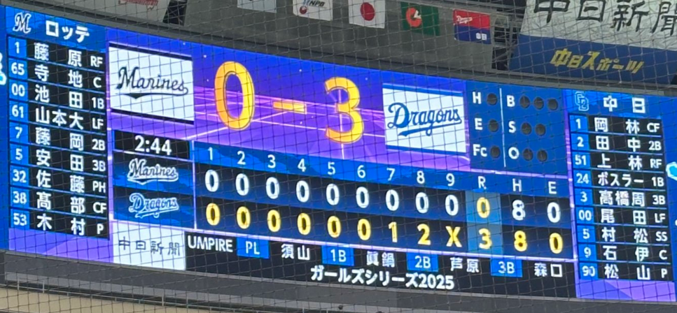 6月6日~6月8日 に バンテリンドームで行われた対ロッテ戦 見事に3連勝いたしました6月6日は プライムツリー赤池 でつばきファクトリーのリリイベに参戦していて試合はみていませんが 勝っていました6月7日は イオンモール常滑 のロージークロニクルのリリイベに参戦3か月ぶりの常滑リリイベ to”常滑牛乳シール植村葉純”2公演目と3公演目の間に車を出して入れ直すときに9回を迎えて1-3で負けていたので ダメかなと思っていたら3回目の公演のときにロッテファンが 大逆転負け と騒いでいました2点ビハインドの9回2死無照射から3点取ってのサヨナラだったみたいですそして今日は参戦の予定がないので見てました