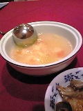 このスープ旨い。揚げ、鶏肉、オクラ、ネギ、干し椎茸。旨いなあ、旨い。ん?干し椎茸ぇーっ?!おととい診療所で尿酸値9.3の宣告を受けて、尿酸値に悪い食い物の上位にあったじゃん。ま、これっぽちならだいじょび。 地味な風貌だね。けど、旨いぜ。ご飯のおかずって料理だなあ。ご飯3杯いっちゃった。いままで、旨いランチをさんきゅー。