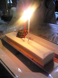 カミさん曰く、今日生あるのが嬉しいんだって。歳を重ねたって、Happy Birthdayだぜ。生きてると色々あるんだよなあ。さて、ご馳走をいただきましょう。1800はまだ明るいね。俺も乾杯の生ビールはおつきあいしたよ。 魚介類の前菜。シマアジ、ホタテ貝、ミル貝。後から来る焼物の皿が空いてるの。貝はお好みでカクテルソースでもってことだったのだけれど、佳かったよ。もちろん残ったカクテルソースは割りばしの先で掬って嘗めるのよ。エコだね。旨え。 焼き物はカミさんの大好きな鮎でした。熊野川の鮎ですって。これは、とてもとても旨かったなあ。ていうか、正しい日本語で伝えるなら、オニウメーみたいな。 ワインはボジョレ・ヴィラージュ(多分)さあ。たまには俺だってワイングラスくるくる廻して、口の中でぶくぶくするよ。 それはともかく、肉の断面、でけえ! これ、絶句。実はランチコースはやっつけたことがあって、こんな旨いローストビーフは食ったことがないと思ったのだけれど、違え(あえて現代語訳ですよ)! なんて広大な面積の肉なのかしらん。カミさん、半分残しましたから。いっぱいいっぱいなのに、それ、俺食いましたから(ふう、ふう、ふう、ふう)。帰ってから、あの肉、食っとけばなあなんて、絶対思うからね。 デザートは六種。その頃は夜景もこんなに綺麗になりました。
