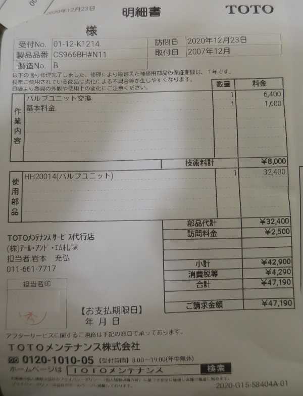 また、TOTOの修理センターに連絡するか、水道トラブル業者に連絡すべきか悩んでおりますので、アドバイスいただきたいです。』