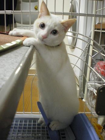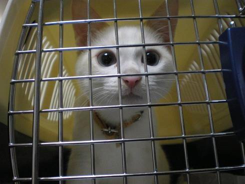 今日は朝から動物病院にいってきました。どこか固定の動物病院を決めておこうと思ったので特に問題はないのですが、いってみました。あと男の子なので去勢手術の相談もニゴさんが我が家に来て初めてのお出かけです。昨日の晩から「明日は動物病院にいこう!」と、とおちゃんと相談をしていましたヒトの話を小耳に挟んだのか?ニゴさん、自分で引っかいたのか、なにかゴミでもはいったのか・・・目のふちが赤くなり涙目ウルウル・痛いのか目をカキカキ・・・。今朝は今朝で、カリカリを食べてご機嫌にお部屋で運動をしていたニゴさん。ところが家の裏の立体駐車場で事故があったらしく・・・「ガーン」という凄い音がして、一瞬、固まるニゴさん。なんとか気分をとりなおし、ゲージに入っていただき動物病院へ・・・・初ケージの写真・・・結構スムーズ。↓街中をゲージにいれられ歩くと少々、緊張気味な表情。おまけにご近所の知り合いのワンコの「カリーちゃん」に遭遇。ここでまた初ワンコにビックリで「フーーーーっ」とお怒りモードなニゴさん。何とか病院に到着し、診察室ではダックスフンドさんに遭遇・・・しかしゲージの中だったのでニゴさんには見えなかったかな。診察室では、ゲージを開けてもなかなかでてこずとおちゃんに引っ張り出されてました。先生にあちこち見てもらい、外見上は異常ないとのこと結膜炎用の目薬をもらいました。で体重が・・・2.15キロ☆我が家に来た時が1.6キロくらいだったので、2週間でちょっと大きくなりました先生に去勢手術の時期は12月か1月かな~と教えてもらい、本日は終わり。動物病院の前にケーキ屋さんがありここは見逃すわけにはいかず、とおちゃんとかあちゃんはケーキを買ってかえりましたニゴさんにはあまり関係ないか・・・以下、本日のかあちゃんの戦利品↓お昼からはかあちゃんとお昼寝・・・ゴロゴロゴロゴロ・・・と一緒に一時間くらい寝ました。結膜炎に初ワンコに、先生に・・・お疲れでしたか?ニゴさん。