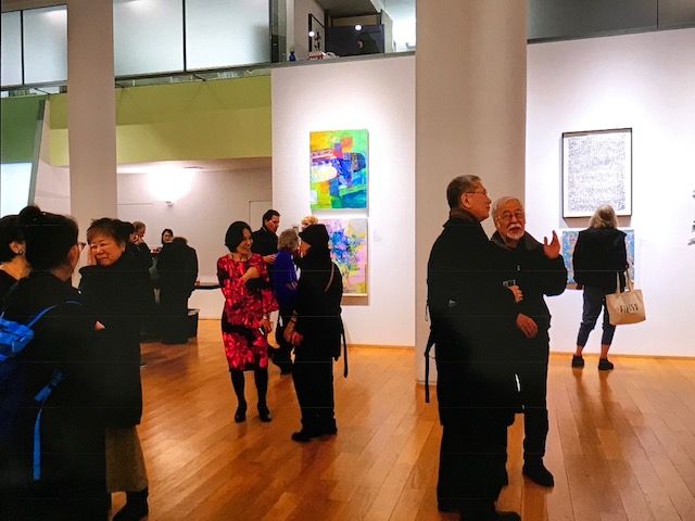 やっとレセプション風景まで漕ぎ着けた。何時もレセプションでは結構暇しているカズ姫。だから、自分で、レセプション風景も沢山撮っていた。でも、今回、いろいろな人と話すのが忙しくて、レセプション風景は一枚も撮れなかった。だから、他の人達が、レセプション風景を送ってくれるのを待っていたら、随分遅くなってしまった。真ん中の赤と黒のドレスを着ているアーティストが、この展覧会の企画から実行まで一人で引き受けて下さった。寄付集め、年代別の記事から、作品情報のタイプまで、また、今日のレセプションの用意など、本当にお疲れ様。感謝。お陰で、楽しく有意義な時間と空間をシェアすることが出来た。本当に有難う。前の、年代別の作品を見て頂けると分かるが、この写真で正面右側は、1970年代、左側が、80年代。とてもいい壁面なので、2段掛けにしても、窮屈な感じはしない。この写真で、左から二番目の方は、カズ姫の古くからの友達だが、今回は、お話はしたが、作品と一緒に写真を撮るのを忘れてしまった。この写真を撮ってきださった方に感謝。この写真からも、彼女が楽しく過ごされたようで、嬉しい!!!ゆったりとした空間で、ゆったりとお話がはずんでいるようだ。一人、新旧2作品での展示は、難しかっただろうに、とてもよくまとめてある。展示係をボランティアして下さった方々に感謝。あちことで、グループ写真を撮り合う風景も微笑ましい。カズ姫は、娘と娘の友達に向かって、何やら熱弁を奮っているようだが・・・。手に持っている、グレーの紙ばさみの中には、母が60何年もの間取って置いてくれた、カズ姫の小学校一年、三年生の絵が入っている。シャイなカズ姫は、持って行こうか迷ったが、母が後押ししてくれて、持って来た。色々な人が、とても興味を持って見てくれた。小学校一年生の絵を今まで取って置いてくれた母の気持ちに、みんな感動してくれた。右側の黒い服を着ているのが右側の作品のアーティスト。左側の作品のアーティストは、ブルーのドレスを着ている方。これが、普通の展覧会なら、小学校の時の絵など、いくら後押しが有っても、或いは、母も後押しはしなかったかもしれないが、長いアート生活を振り返ると言う、特別企画だったのでこの場にもピッタリ。そして、こんな時に、古い絵が出てくると言事も、何か示唆的だ。多くの人が、ほぼ完璧な形で残されていた絵を楽しんでくれた。3年生の人物画には、みんな、普通、3年生では描けない絵だとか、私は、日本の子供のお受験用に、絵をし教えているが、小さい子ってなかなか描けないと言っていた。風景画を見て、山の色合いが微妙に出ているとか、緑の木々を見て、風を感じるとまで言って下さった方がいた。これが、カズ姫が日本での全ての学歴や職業を捨てて、日本では、中学校以来かたこともない絵を勉強しようと、スーツケース一つ下げてNYに乗り込んだ原点。母のお陰だ。全てに感謝。さあ、会も中ほどになったころ、JAANYの会長の挨拶が有った。会長の真ん前の壁面、右側に展示してあるのが、彼が、60年代にNYにやって来た頃描いた絵と、近作。色々な方の写真をお借りしているので、反対側からの写真もある。その後、みんな集まったところで、出品者のグループ写真を撮ることに。この写真は、被写体の方の誰かが撮ったのだろうか・・・。面白い写真だ。カメラマンも段々多くなって、どっち見ればいいの?と言う被写体たちからの声。被写体もまだ準備中。さあ、みんな揃ったかな。と言っても、21名中17名しかいない。何時も、全員が揃う事はまずないが・・・。43年前の作品と、昨年12月に仕上がった、ほやほやの作品とカズ姫の3ショット。着ている上着は、母の遺品。付けているブローチは、娘が小学校の時に学校のバザーで買ってくれた、パレットに絵筆のデザイン。🎨上の絵を描いた頃は、カズ姫がまだNYに渡って間もない頃、我が娘の年頃。それから、ドレスなどに筆で絵を描く、ハンドぺインティングの仕事、広告関係の仕事等々経て妊娠出産。妊娠が分かった瞬間に、絵筆はポトリと落とし、子育て邁進。下の絵では、自分が育てた只のモデルも使っている思えば、長い年月が経っているのに、昨日の事の様だ。昔を、昨日の事のように感じるのは、年取った証拠らしいが・・・。でも、カズ姫は、まだまだこれから娘の友達も集まってくれた。右側の男性とは、話が合って、長いこと話してしまった。色がとても綺。反対(赤系と緑系)の色なのに、とても調和している。普通赤と緑を使えば、サイケデリックな、強い感じになるのに・・・。違う視点での世界が、同一平面上にあると言うのは凄く面白い。彼は、物語を作って、まずそれを、コミックブックにして、それから、それが出来たら、それをフィルムにしたいと言っていた。そして、一作目のコミックブックはカズ姫に進呈してくれることになった。”貴女の絵から、とてもインス