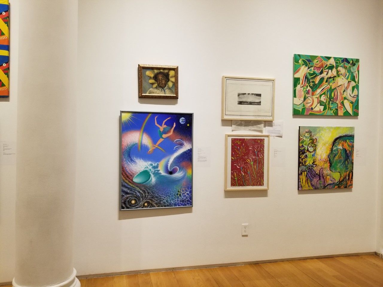 カズ姫は、写真をを撮りたかったので、意図的に早く出たが、バスも早く着いてくれたので、オープニング出席者が集まる前に、全ての作品や、作品情報を写真に撮れた。一人一人の作品を載せると、膨大な数になるので、壁面ごとに載せた。絵の大きさは、隣に貼ってある、作品情報と比べて頂けたら、およその見当がつく。展示形式は、旧作品が上、新作品が下。展示順は、旧作品の制作年代別。新作品は、ほとんど、2017以降(何点かは、それ以前)。右、中が60年代。左の絵から、70年代。左の縦2点がカズ姫の作品。上が旧作品(1975年作)、下が新作品(2018年作)。一応、カズ姫の作品情報を例として載せるが、全ての出展者の作品情報がこの様な形式で付いている。もし、興味がある、或いは気に入った作品などが有って、作者や作品情報を知りたい場合は、何年代の右、中、左で知らせて頂ければ、その作者・作品情報を載せることが出来る。右は、70年代。真ん中の作品から80年代。以上、合計20名の新旧作品40点が展示されている。