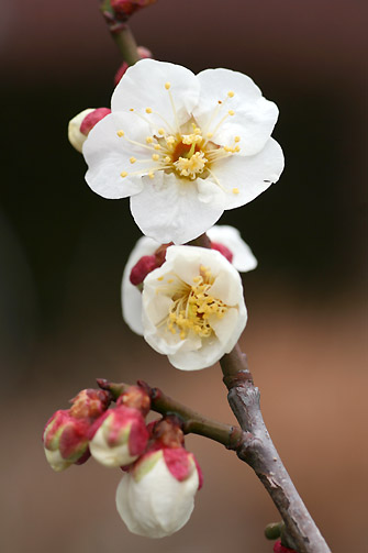 春一番も吹き、ウメの花が咲き始めました。 今回ご紹介しましたのは、ちょっと変わったウメの木です。 「青軸(あおじく)」といいます。 花の色は白ではなく淡いクリーム色で、名前のとおり あたらしい枝とガクが緑色の品種です。 普通のウメは、ガクはアズキ色で、あたらしい枝は 灰色がかっています。 実の大きさや、実る時期は他の品種と大きな差は ありませんが、花の時期はこの木だけ黄色っぽく見えます。 普通のウメの花と見くらべてみて下さい。 「知ってる?」といって、ウメの品種の違いを(知らない人に) 教えてあげると、ちょっと鼻だか気分になれるかもしれませんね。(笑)