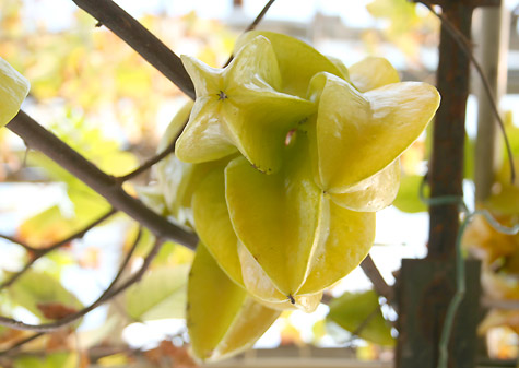 3月上旬頃のお話ですが、 鹿児島大学の指宿(いぶすき)植物試験場に行ってきました。 温室を案内していただいてビックリしたのは、食べごろのスターフルーツがところ狭しと、たわわに実っているところでした。。。 これには驚きました。 さすが南国九州! 星型に見えるようカットして、サラダにちょっとのっていたり、 会社で取り扱いしている鉢植えに、たまに見られる程度。 せいぜい、そんなもんでした。 果実を横から切ると、星型になるので「スターフルーツ」と呼ばれて いますが、これが「カタバミ科」だというので、また驚きです。 カタバミというと、雑草のカタバミと、園芸種のオキザリスなど、 「草」ものだと思っていましたものね。木もあるんですね。 どこかのお菓子メーカーのセールストークに 「ひと粒で2度○いしい!」とありましたが、 スターフルーツは 「1個で2度おどろき!」でした。 もっとも、このジョークを理解できる人は 昭和○○年代生まれの人だけかもしれませんね。(笑)