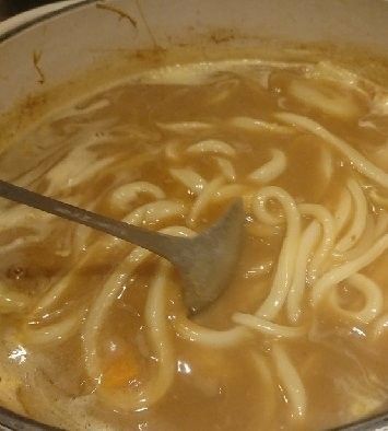 そして、ルーをどっさり入れて炊き込み、うどんを入れます。
