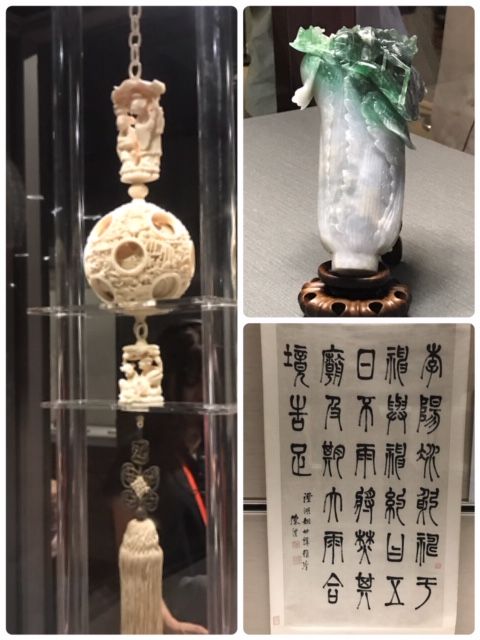 写真は、象牙の多層球、翠玉白菜、1800年代の篆書。