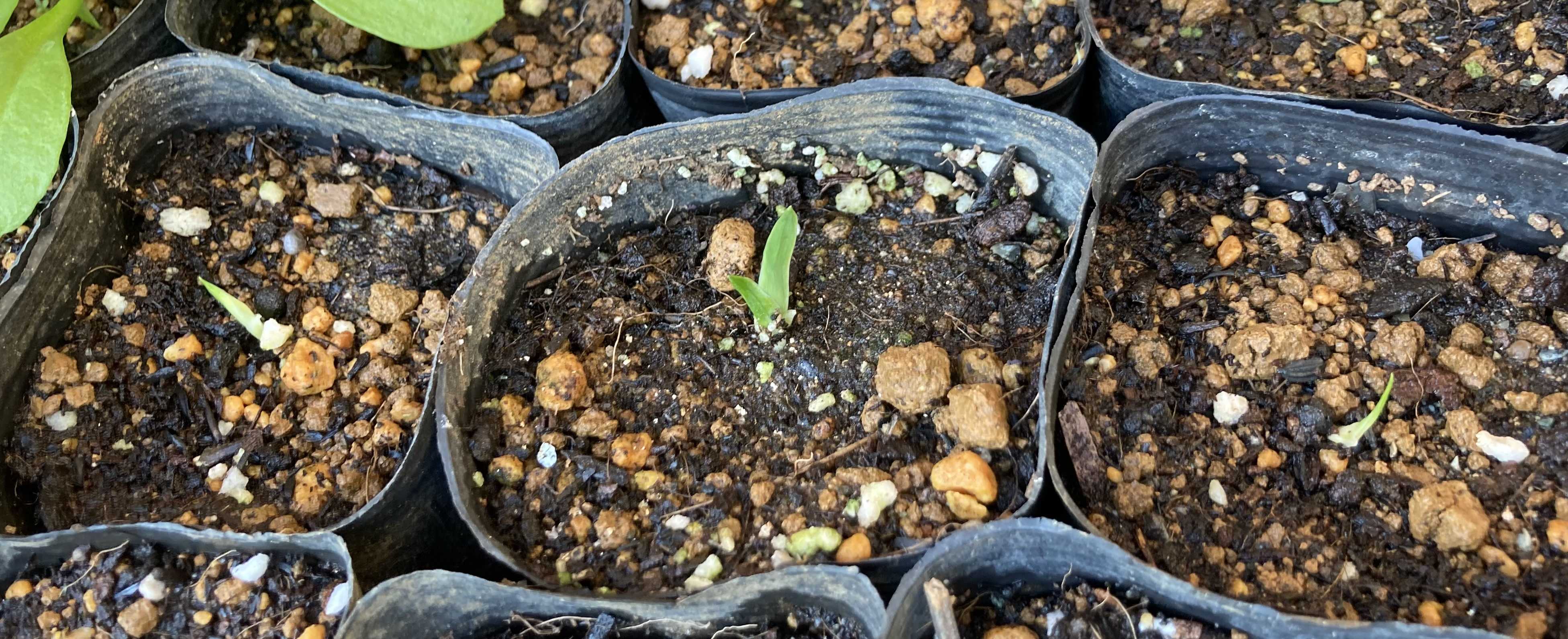 2年前、中学校の時の友人と隠岐の島旅行をしたとき失敬した原野のヒオウギの種の芽