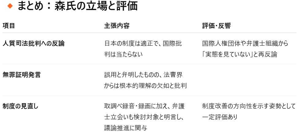 「人質司法」や「日本の人権無視」への国際的批判に関連して、森まさこ元法務大臣(参議院議員、自民党所属)が過去に行った発言や対応を時系列で整理いたします。---🔹背景:「人質司法」とは?* 日本の刑事司法制度において、被疑者・被告人が自白を拒むと保釈が認められず、長期間拘留されるという慣行が「人質司法」として国内外から批判されています。* ゴーン被告事件(2018年)を契機に、国際社会からの関心が高まりました。---🔸森まさこ氏の経歴(関連部分抜粋)* **2019年10月 – 2020年9月**:第100代 法務大臣(安倍内閣)* 弁護士資格を持ち、法曹出身の政治家---🔹森まさこ氏の主な発言・行動✅ 1. ゴーン被告逃亡時(2019年末)への対応* **2019年12月31日**:カルロス・ゴーン被告が日本からレバノンへ逃亡。* **2020年1月5日(法務省発表)**:森まさこ法相が記者会見を行い、以下のように述べました:「我が国の刑事司法制度は、憲法および法律に基づき適正に運用されている」「我が国の制度を人質司法と批判するのは当たらない」「逃亡したゴーン被告こそが司法を踏みにじった」 ✅ 2. 国際的批判への対応姿勢* **2020年1月中旬**:英・仏・レバノンなどから「長期勾留」「弁護人の立会いなし」などを問題視する声。* 森法相は以下のような趣旨を繰り返し述べました:「日本の刑事司法制度は法の支配のもと、適正な手続を確保している」「外国と異なる制度を理由に、一方的な非難は適切ではない」* 国連や国際人権団体が指摘する「取り調べ時の録音録画義務」「接見交通権の制限」などについて、法改正の必要性を否定。---🔸 批判とその後の影響* 森氏の発言は、日本の制度を擁護するものでしたが、以下のような国内外の批判もありました: * 「自己正当化に終始し、問題の本質を見ようとしない」(日弁連、一部メディア) * 「制度改善の意欲が見えない」「国際基準との乖離が深刻」* 一方、森氏は再審制度の改善や、性犯罪刑法改正などにも一定の取り組み姿勢を見せており、刑事司法全体への理解は示していたとの評価も一部にあります。---🔹補足:現在の動き* 2020年代に入り、再審法の見直し、取調べの録音・録画義務の拡大など、一部制度改善の議論が続いています。* 森氏本人は現在も参議院議員として活動中で、司法・法務関係の発信も行っていますが、「人質司法」問題については近年ではあまり発言していないようです。---🔸結論として森まさこ元法相は、在任中「人質司法」という国際的批判に対し、日本の刑事司法制度の適正性を強調し、制度擁護の立場を貫きました。その姿勢は一部から強い批判を受けましたが、制度全体の議論を喚起するきっかけにもなりました。---以下に、森まさこ元法務大臣が「人質司法」や取調べ・録音録画、弁護人の立会いなどに関して行った主要発言を時系列で整理しました。---🔹2020年1月:ゴーン被告逃亡後の記者会見など1‑1. 「人質司法」批判への反論(2020年1月9–14日)* **森氏の主張**:「日本の刑事司法制度が前近代的であるという批判は当たらない」「人質司法との批判は全く当たらない」([japan-indepth.jp][1])* **理由付け**として、日本では令状なしの逮捕は原則禁止、勾留・保釈は裁判所の審査に基づくと説明し、「適正な手続が確保されている」と強調([japan-indepth.jp][1])。1‑2. 「無罪を証明すべき」との誤発言(2020年1月9–10日)* 臨時会見で、ゴーン被告に対し「潔白というのならば、司法の場で正々堂々と**無罪を証明**すべき」と発言([iwj.co.jp][2])。* 後日、ツイッターで「“証明”と言い違えて“主張”と言うべきだった」と訂正([iwj.co.jp][2])。* 法曹界からは、「有罪の立証は検察官の責任」「推定無罪の原則を無視している」と批判が殺到([iwj.co.jp][2])1‑3. 記者会見で制度防衛(同時期)* 「逃亡した本人が司法制度を批判するのは論外」「制度には令状制や裁判所の審査が備わっている」「各国制度に違いがある」と改めて強調([japan-indepth.jp][1])。---🔹2020年4–5月:国会・法務委員会での質疑 2‑1. 取調べ録音・録画と弁護人立会い(2020年3~5月)森氏は国会で以下の内容を質疑で指摘:* **4月8日**:「刑訴法改正附則第9条には、録音・録画だけでなく弁護人立会いも“見直し対象”と明記されている」と説明([ameblo.jp][3])。* また、法務省の「検討会(在り方協議会)」でも録音録画とともに「弁護人立会いの是非も検討対象に含まれる可能性がある」と語っており、「見直しを含めた議論が進められるべき」と訴えた([innocenceprojectjapan.org][4])。2‑2. 参議院法務委・質問(2025年5月16日)* 森氏は、2019年12月時点の「検察行政刷新会議報告(附則9条)」が弁護人立会いの検討を明記していたと指摘し、「現職大臣も議論に参加すべきだった」「議論予定を実行に移す責任がある」と強く主張([moj.go.jp][5])。------🔹引用抜粋(発言の中から)> 「日本の刑事司法制度が前近代的であるという批判は当たらない」「人質司法との批判は全く当たらない」([iwj.co.jp][6])> 「潔白というのならば、司法の場で正々