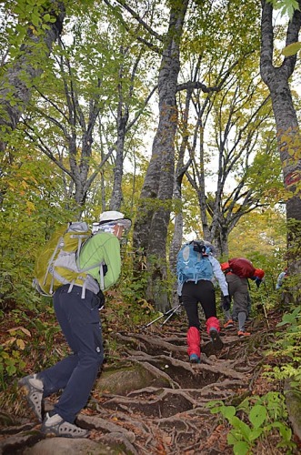 10月4日、今年3回目の村民登山は、百名山の一つとして近年超人気の雨飾山。13人の参加者は(一般5人、会員8人)、まだ暗い午前4時45分に出発しました。朝5時半、登山口に着いた時には50台の駐車スペースが満車状態で、あふれた車が路上駐車をしていました。実は計画段階に、下見時の状況や、種々の情報収集で、遅くなると駐車できないということや、岩場やはしごでは登山者が多く渋滞になるということを話しても信じてもらえず、でも自説を曲げずに日程を組んだので、駐車場がガランとしていたらどうしょうと、変な心配をしていたのです。現実は予想通りで、ホッとしました(笑)。前夜の天気予報は「晴れ、日本海では朝のうち雨のところも」。着いた時から、霧、きり、キリで一時小雨。(小谷地方には朝、大雨注意報が出て、留守本部では心配したそうです)大降りにはならず、でも霧も晴れずで、紅葉も霧に沈み・・といった状況でしたが、いろいろなハプニングを巻き起こしつつ、なごやかな登山となりました。 元気な青年部(体力も喋りも)のおかげか、笑いのあふれた山行でもありました。帰村後の反省慰労会でも、会員みんなの笑顔がはじけ、ほっこりとした気分で家路についた私めでありました。山頂で北峰の石仏たち気になっていた「ツルニンジン」はこんな実になっていました。また、山ぶどうもさるなしも熟して、山の味を少し味わいました。特にさるなしの完熟は絶品!!