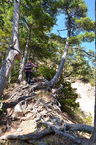 竹村新道はいきなりの急登。結構な急斜面、両側がこれまた結構切れ落ちていて慎重になる。40分程急登すると展望台。雲が切れ、独標が大槍・小槍を従えて現われた。見えないけれど、千天出合から北鎌尾根P1までの高低差は半端じゃない。さらに独標まではp14まであるらしい。今どきは千天出合から登るより、大天井から澤にくだって北鎌のコルから登る人が多いらしい。上から覗いただけでも、千天出合に行く湯俣川の崩落はすごいと思った。真下のその湯俣川に小さな噴湯丘がみえる。カメラの倍率を最大にして撮った。さらに家でその部分を切り取った。この近所では、川を掘ればどこでも野天風呂だそうだが、私のような者もいるから気をつけよう!!湯俣川上流には裏銀の稜線が、逆方向には餓鬼から燕の稜線が、さっき川添いに見たときよりもぐっと高度を増してつなかっていた。逆光のせいで、北鎌の表情が判らずに残念。晴嵐荘に泊まって、朝日の下で撮ったらすごい写真になるだろうけど・・・北鎌独標に見送られ、また会う日を楽しみに別れを告げた。