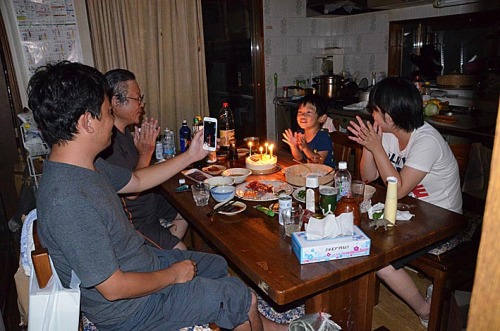 お盆、孫の仁翔が5泊しました。ちょうど8月12日は、じじの誕生日。じじに内緒で、誕生パーティーの準備。仁翔一家にとって誕生日の象徴はケーキのようで・・・みんなでハッピーバースデイtoじじを歌い、ろうそくを吹き消すしたのは「仁翔やる!」と立候補した仁翔。「誕生日おめでとう じじ」と書かれたチョコレートのプレートも仁翔が食べました(笑)。そういえば、去年の仁翔はまだ「吹く」ことができなかったのに、成長したのです。14日は私の実家に行き、盆踊り。一昨年、ここで「盆踊り大賞」をゲットしているじじは、今年も大賞ねらいで、仁翔を肩車して踊ります。「一等賞になればおもちゃがもらえる」と言われたのか、仁翔も一生懸命、手で踊りました。結構いい雰囲気だったのですが・・・・でも、柳の下にそうそうドジョウはいません。仁翔のがっかりした顔。最後に別のゲームでおもちゃがもらえ、喜びが爆発。帰り道、「仁翔ね、すいか割りもできなかったし(番が回るはるか前にすいかが終わってしまった)、盆踊りでももらえなかったから、悲しかったの。 でも、もらえたから良かったぁ」と何度も何度もお話ししました。