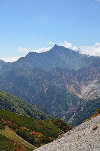 全く未知の山域、裏銀座方面。今回、憧れの雲の平に行くことができました。もう、1人で未知の山域へ何泊も登山することはできないと自覚もしていたので、憧れは憧れのままで終わるかなと思い始めていたけれど。助っ人Yさんと、シルバーウィークのおかげです。コースが決まってからも実は不安の連続で、止めた方がいいかなと、何度迷ったことか・・・。孫預かりが終わってホッとして、何気なく周囲の山々を見ると、何やら完全に秋モードに突入しているような・・。おっ、季節が変わっている、気づかない間に変わっている。季節の移ろいを見逃してなるものか!と、ふんぎりをつけたのが、出発2日前でした。極力荷物を少なくし、見てくれよりも実をとり。一眼レフのカメラさえ持っていくのをやめようかと思ったくらい。さすがにカメラは置いて行けなかった(笑)。19日早朝、Yさんと合流し、京都に行く夫に七倉まで送ってもらい、高瀬ダム奥の登山口から入山した。5連休ということで、七倉の駐車場は満杯以上。タクシーの運転手さんも「こんなに大勢の入山者は初めて」とびっくりしていた。この5連休は、山小屋の混雑につながり、2人で1枚のふとん使用、正規の夕食では食材が不足し臨時献立になったり、テン場がたりずに指定地から大幅にはみ出したり・・・というアクシデントの連続だった。他の山域でも同じだったのだろうかな。まっ、5連休がなければ、奥までこれなかったのだから、仕方がないかもしれない。今度来るときがあったら、静かな山小屋の雰囲気を味わいたいと思った。(今後は、後立山だけで良いと思った気持ちは、既に2日目にして崩れかけ・・・笑)9月19日、ブナ立て尾根入口。三大急登の一つということにとらわれて、いささか緊張していたのが良かったのか、コースタイム通りに登ることができた。余力があったらということだった烏帽子岳のオベリスクを見て、南沢岳手前の四十八池辺りまで足を延ばした。紅葉が始まっている中で、種子を飛ばして役目を終えたチングルマの綿毛が白く光っていた。オベリスクに向かう稜線からの烏帽子小屋。烏帽子小屋の前は、一面にイワギキョウが保護されて咲いていた。雲がかかっているのは燕岳からの表銀座方面。右には明日向かう三ツ岳方面の稜線が続く。20日、今日は昨日にも増しての快晴。秋の雲も、紅葉の山肌も朝日を受けて更に赤く。三ツ岳に登ると、前穂の三本槍を左に従えた槍ヶ岳が目に飛び込んできた。思わず「ワーッ!」。東、西、北の鎌尾根が三方向に流れ出ている。はるか昔に歩いた東鎌尾根が懐かしい。後を振り返ると、いつも目にしている後立山の峰々が、別の形で連なっている。鹿島槍ヶ岳の双耳峰の方角が最初わからずに戸惑ったが、こうして見ると、後立山の盟主はやはり鹿島槍かなと、最近は五竜岳に惚れていた自分を反省した(笑)。巻く予定でいた野口五郎岳も山頂へのルートをとる。黒部湖に流れ込む東沢谷をはさんで、右手に水晶岳が大きな山容を見せている。名前も素晴らしいけれど、谷から登りつつある薄い紅葉の衣が、黒岳とも呼ばれる山頂の黒い岩肌にマッチして素晴らしい。今までに一度も対面したことのなかった水晶岳(黒岳)、たちまち大好きに。右手下に見える池は、五郎池。ここから紅葉の波が上昇しているようにも見えた。裏銀の山々には池塘が多いと思った。山が大きいせいか、深いせいか、気のせいか・・・。