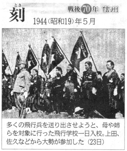 昭和19年5月23日に載った信濃毎日新聞の写真。「多くの飛行兵を送り出させようと、母や姉らを対象に行った飛行学校一日入校。上田、佐久などから大勢が参加した」当時、上田市には県下一といわれた上田飛行場がありました。もともとは、昭和5年の繭糸価格の暴落による農村の救済のために、政府の融資を受けて千曲川の河原を開墾。しかし、農業に適さないとわかると飛行場に変更。民間飛行場として使っていたが、拡張整備して、昭和8年に陸軍省に献納して「陸軍上田飛行場」となりました。山岳地方耐寒飛行演習に最適との評価を得て、昭和12年に熊谷陸軍飛行学校上田分教場となり、さらに拡張整備されていきます。やがて、ここで養成された搭乗員は、特攻としてここから飛び立つようになりました。この写真に写っている女性たちも、自分の息子を、自分の兄弟を、飛行兵にすべく説得したのでしょうか。「母親、年寄りは情意的立場からなかなか応ぜず…最後の決定をなす…毎夜12時2ヶ月を要す」と書いたのは、日本一多くの満蒙青少年義勇軍を出した長野県を支えた信濃教育会傘下の一つ、旧波田村波田小学校の訓導(教師)。義勇軍への参加を進めても、母親や年寄りはなかなか良い返事をせず、毎晩、12時まで説得し続けた。そんな日が2ヶ月も続いたという意味。命を産み出す母親は、本能的に忍び寄る危険を察知し、年寄りは長い経験から危険を見抜く……。本能どころか、今の日本は自ら戦争を仕掛け、危険の中へとまっしぐら…のような気がする。息子も孫も絶対に死なせはしない…と思う毎日ではあります。