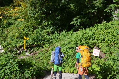 24日、湯俣までのトレッキングを楽しみました。 紅葉はいくらか遅いかなと危惧していたけれど、紅は最盛期(タクシーさんの話では10℃以下に下がらなかったため、発色は2・3日前とのこと)で、今秋何度目かの紅葉に癒されました。 高瀬ダム発7時15分、帰着15時30分。ほぼ予定通りの行程でしたが、湯俣での2時間を、裏銀につながる竹村新道の展望台まで登ったため、最長休憩は15分という結構ハードなトレッキングとなりました。最初は、目玉の一つ「噴湯丘」へのルートが壊れて行けないため、晴嵐荘で「黒ラーメンを食べる」予定でしたが(笑)。高瀬ダム上から噂に聞く高瀬隧道(934m)とワモリ隧道(313m)を通る。今まで何度か湯俣行きを計画しても、このトンネルを一人で通過する勇気?がなく断念していたので、今日の熟女トリオの山行はほんとに有り難かった。入ってみると、ちゃんとそこそこ明るい電灯が点き・・・いやいや、トンネルの中を吹き抜ける冷たい風と音、その中を一人で10分以上も歩くのはやはり勇気がいるわ・・。でも、ワモリ隧道の入口は紅葉のデコレーションがされ、心憎いばかりの自然のもてなしだと思った。トンネルから出るとやや白いエメラルドグリーンのダム湖が出迎えてくれた。高瀬渓谷沿いの道は、最初の1時間は車も入れるほどの広い道。湖から渓谷沿いになると、林道には枯葉が厚く積もってカサカサコソコソ・・・。左岸の山々と青空の間には、先日登った烏帽子岳から野口五郎岳につながる裏銀の稜線が見え、右岸には餓鬼岳から燕岳の稜線が。いいなあ、また行きたいなあ・・・・。ナナカマドもガマズミも、みーんな真っ赤な実を青空や高瀬川に重ねていて、溜息がでる。カツラの甘い香りも至る所に漂っている。あまりにもすてきな色彩の葉が落ちていて、思わず上を見る。こんな色合いの創造主は、一体だれ?歩くこと2時間半。谷も狭まってきて、もうそろそろかなと思う頃、高瀬川上流はるか向こうに三角形の山が見えてきた。槍ヶ岳北鎌尾根独標だっ。これ一つでも立派な岳に見える。残念ながら槍の穂先は見えない。雲が切れることを祈る。晴嵐荘が対岸に見えた。私の大好きな吊り橋を、ゆらゆらさせながら渡る。小屋では、10月いっぱいの小屋仕舞いに備えてか、ふとん干しに余念がなかった。「噴湯丘へ行くより、展望台の方がいいよ」と言う山小屋のおばさん(『岳』に出てくるおばちゃんみたいな人だった)の勧めで展望台に向かう。急いで腹ごしらえ。