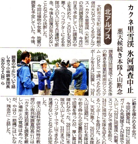 秋雨前線の影響で、北アは毎日雲の中。昨日の新聞で、ヘリが飛べずに1日延期になっていた調査が、今回中止を決定。9月に雪の移動があるかないかにだけにしぼって調査再開となった。ロマンはまたまた持ち越しである。平家の落人が隠れ住んだから「カクネ里」大町側から見えないから「カクネ里」 等々諸説あるが、神秘な北壁ではある。五竜遠見尾根から見る「カクネ里」が大好き。冬のヒマラヤ襞を思わせる雪壁となり、遅くに蝶型岩壁も現われる。今年はまだ遠見尾根を訪ねてないなあ。何時行こうかな。6月の鹿島槍北峰下の北壁とカクネ里