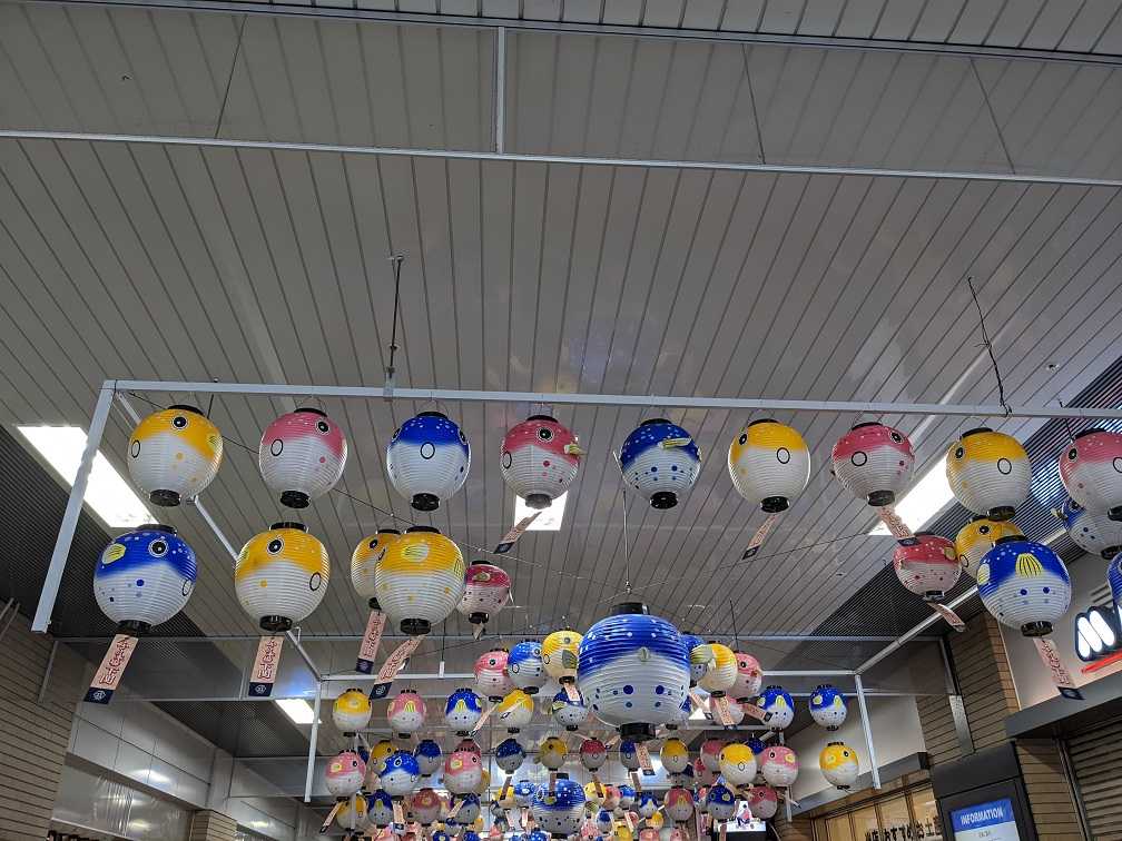 駅構内、1階の自由通路の天井にある、フグの形をした提灯です。