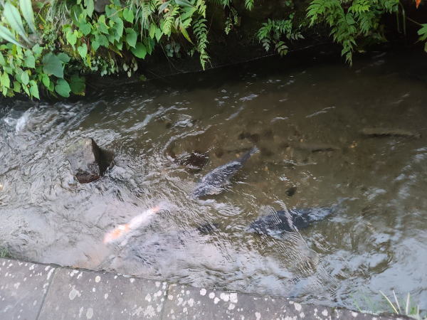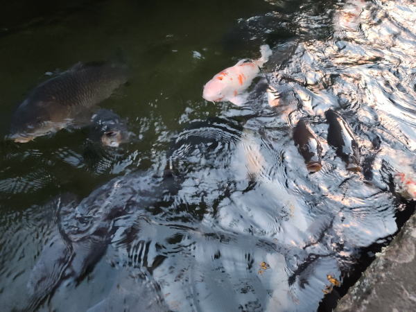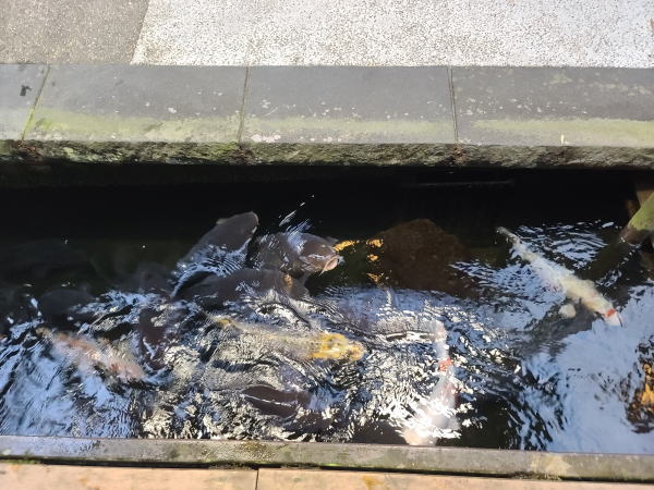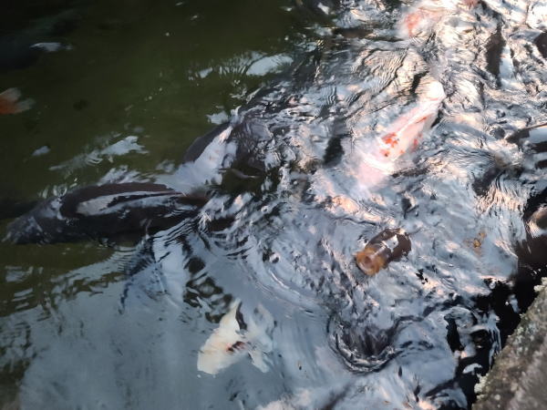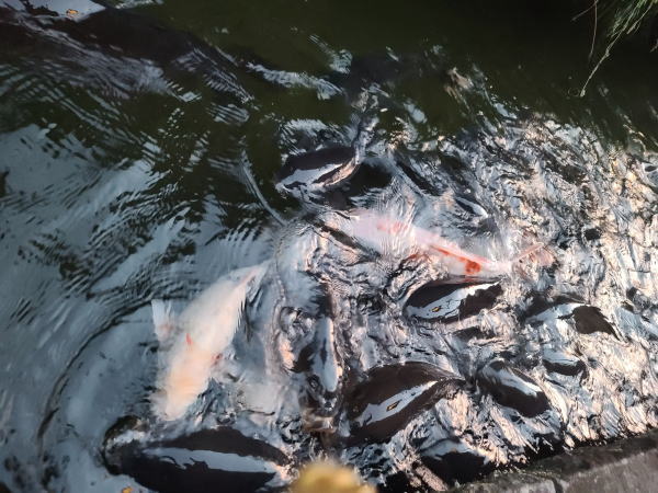 100円で餌が買えて、小川にパラパラまくと、鯉の群れがやってくる。