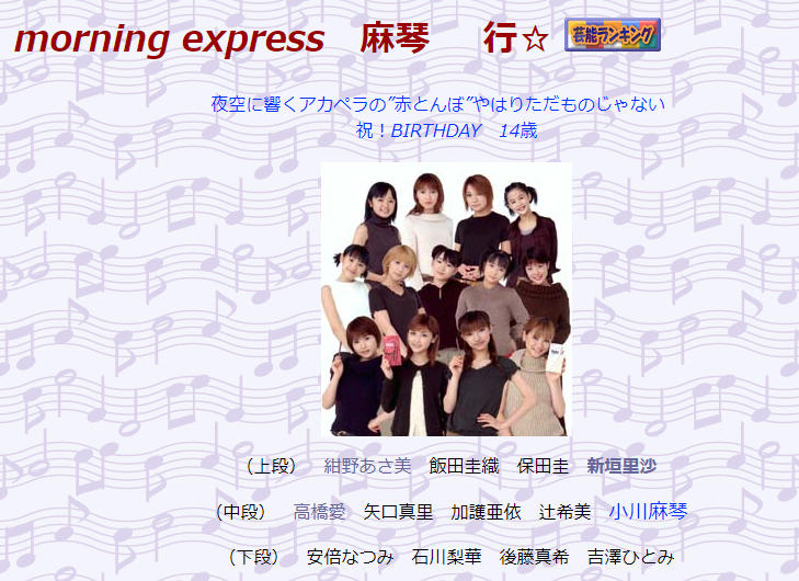 8月に作った5期メンバーサイトの1つなんですがいろいろと大変でしたねモーニング娘。に 第5期生が加わりました (左から)【紺野あさ美】 1987年 5月 7日生まれ B型 北海道出身【高橋 愛】 1986年 9月14日生まれ A型 福井県出身 【新垣 里沙】 1988年10月20日生まれB型 神奈川県出身 【小川 麻琴】 1987年10月29日生まれO型 新潟県出身さすがにこっちのプロフィールは間違ってない