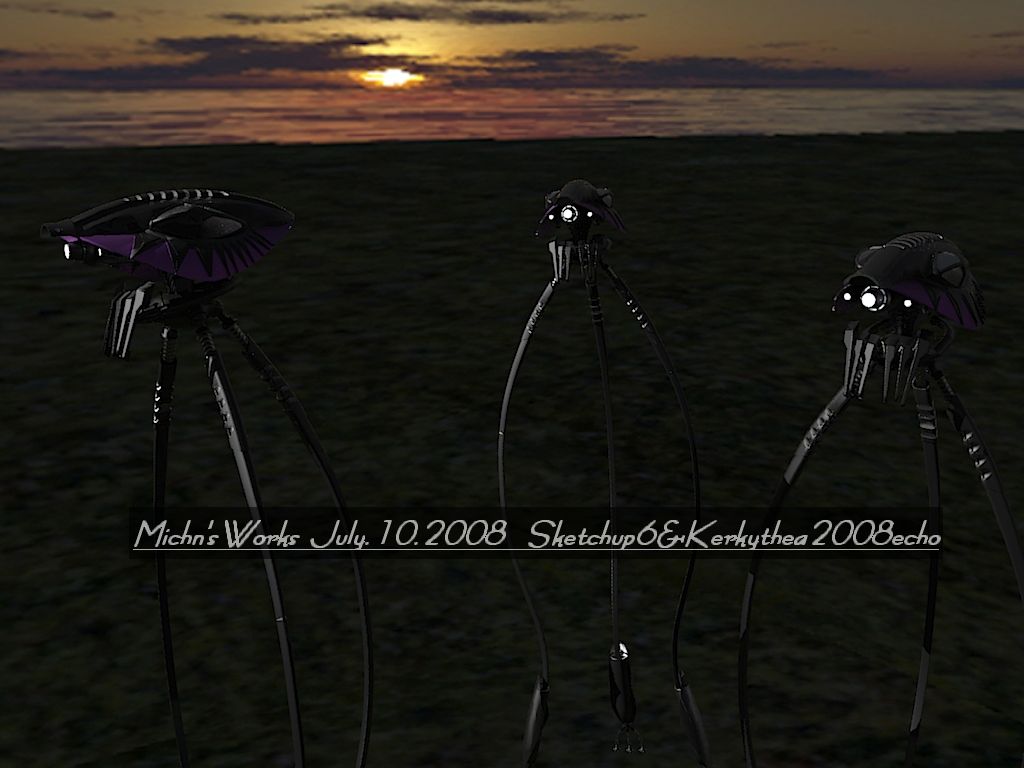 google の3Dギャラリーに映画「宇宙戦争」のトライポッドのモデルがあったのでsketchupに配置し、Kerkytheaの背景でレンダリングしてみました♪実は自分もこの3Dギャラリー内にモデルを投稿しました♪前書いた「ロボコップ2」の敵キャラ「cain」と「tuktuk」です♪皆さんお好きにダウンロードしてみてくださいまし♪ ←応援おねがいしまーす♪