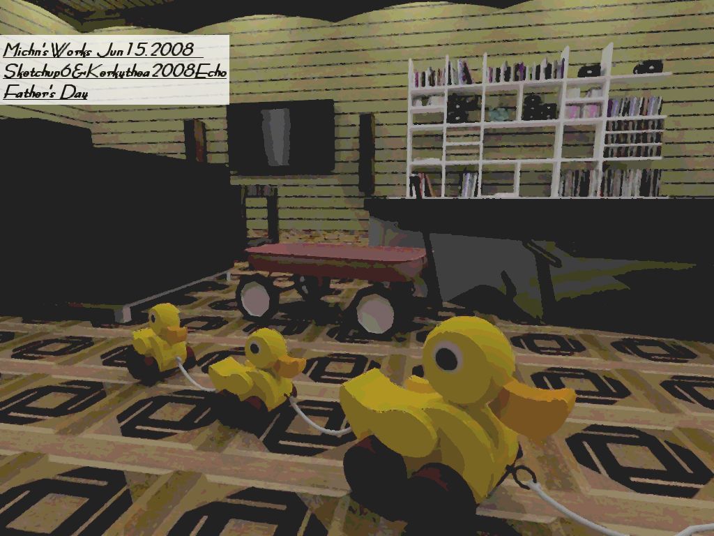 今回、 GoogleSketchUp6+kerkytheaというフリーのレンダリングソフトをつかってまったく初心者の私がどこまで見よう見真似でできるかやってみました♪予備知識はほぼなしでGSU*PARAというサイトにてチュートリアルからはじめました♪とってもわかりやすいサイトでお勧めです!興味のある方はチェックなりー♪とりあえずやってみた画像をUPしてみますのでみんなみてねー♪