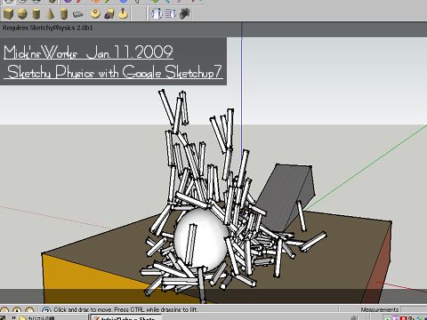 今回はグーグルスケッチアップのプラグイン「Sketchy Physics」の紹介です。2年前くらいに出始めて、その当時は衝撃でした♪フリーでどこまでやらすんかい!!て感じで~けど中々使い方がわかんなくて、つまみ食い状態でした今回は、「物理シュミレーション」お約束の、ぶっ壊し♪他にも、スプリング、ピストン、ヒンジ、モーターなどの部品を仕込んで面白いことも出来ちゃうんですが・・・また、勉強してアップしますYou Tube にアップしました♪ ←push push♪