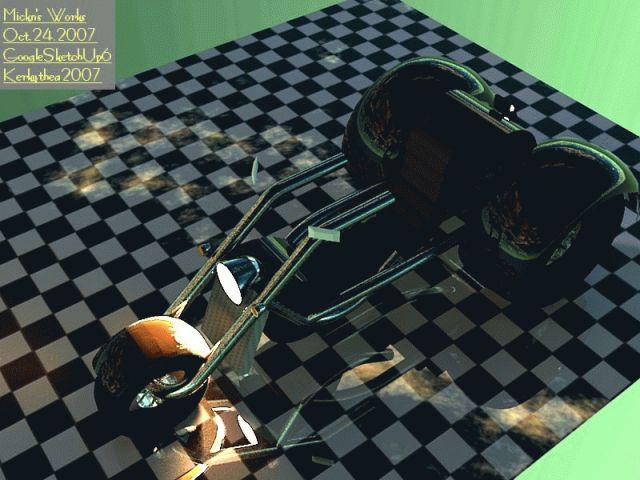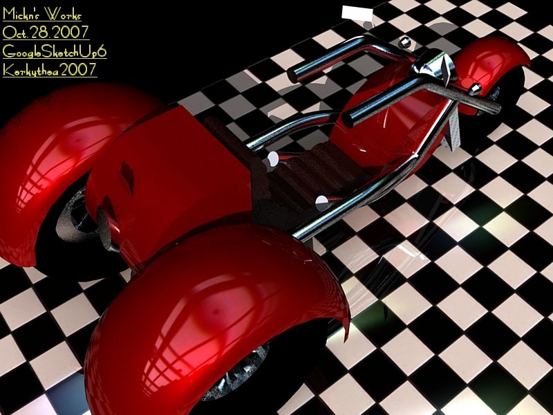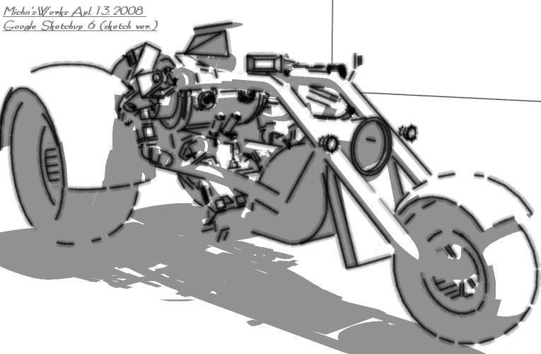 今回はモンスターマシーンの紹介とCGモデリング&レンダリング作品の紹介です。画像のマシーンは「trike」というカテゴリーの3輪バイクです♪バイクといっても実は普通自動車免許で乗れる「自動車」の区分だそうで、言えば「オープンカー」みたいな位置づけなんでしょうか!?大昔の「オート三輪」とは比較にならないパワーです(あたりまえ)こちらのCGは「GOOGLE SKETCH UP」でモデルを作りました。(約4時間)いつものように「kerkythea」でレンダリングして完成です。(約1.5時間)これをみると絶対思い起こすのが「北斗の拳の悪役(ジードのボス)」♪たぶん、街で乗ってる人をみかけたらやっぱ「ヒール」に見えちゃいますよ♪