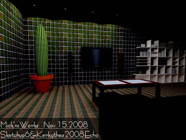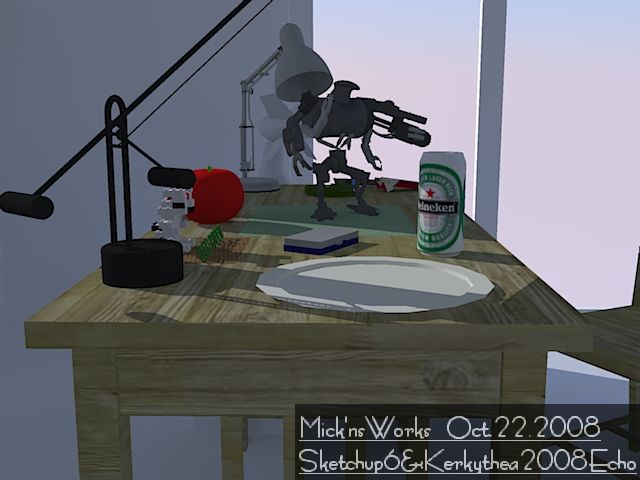 今回は、Indigo Render v1.0.9 にてレンダリングしてみました♪Kerkytheaにくらべると設定は少ないのですがリアルに仕上がる感じです!たとえばグラスのマテリアルなんかは透けて見える場合ちゃんと光の屈折まで計算に仕込まれてるみたいです♪(やったこと無いですが・・)なのでコップの中に入った水を通してみる時、向こうの映像が屈折画像でレンダリングされます♪すごいですねー♪でも時間がスゲーかかります・・・・話は変わって、Googlesketchupがバージョン7になりました♪(英語版のみ)自分はダウンロードして昔使ってたメニュー翻訳ソフト「E-WordChanger2000」で日本語化して使いました♪なかなかよろす♪ ←crick please♪